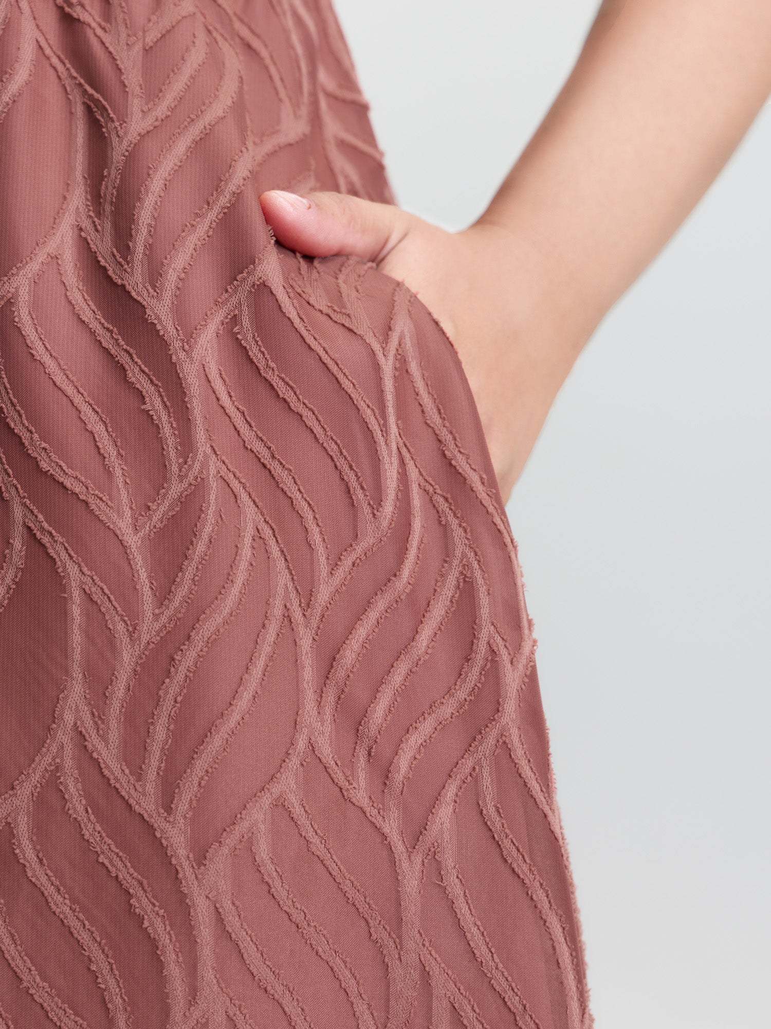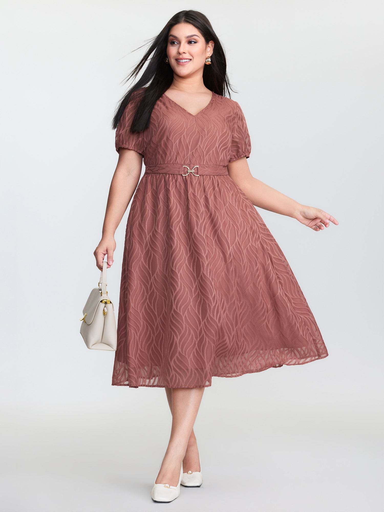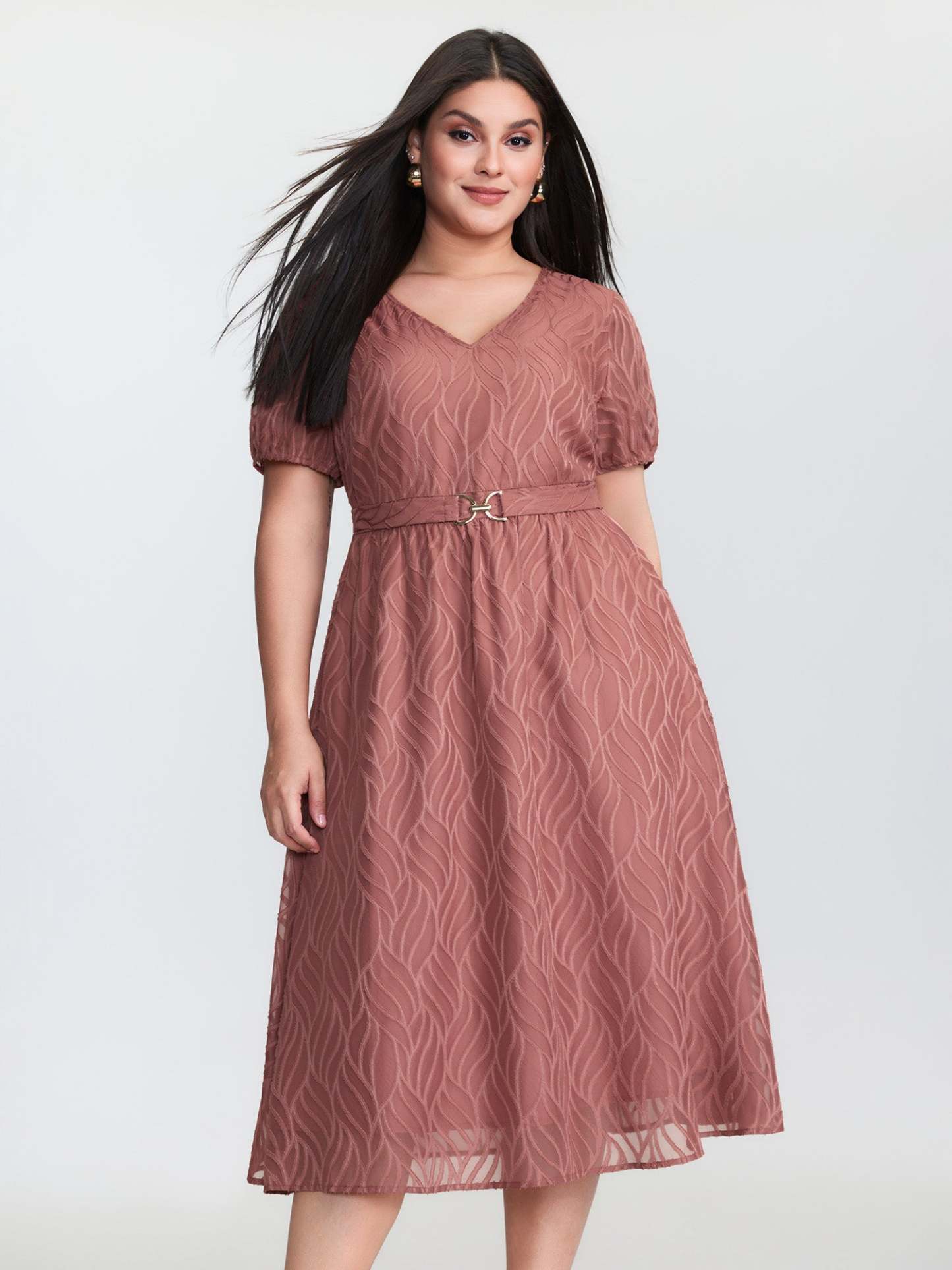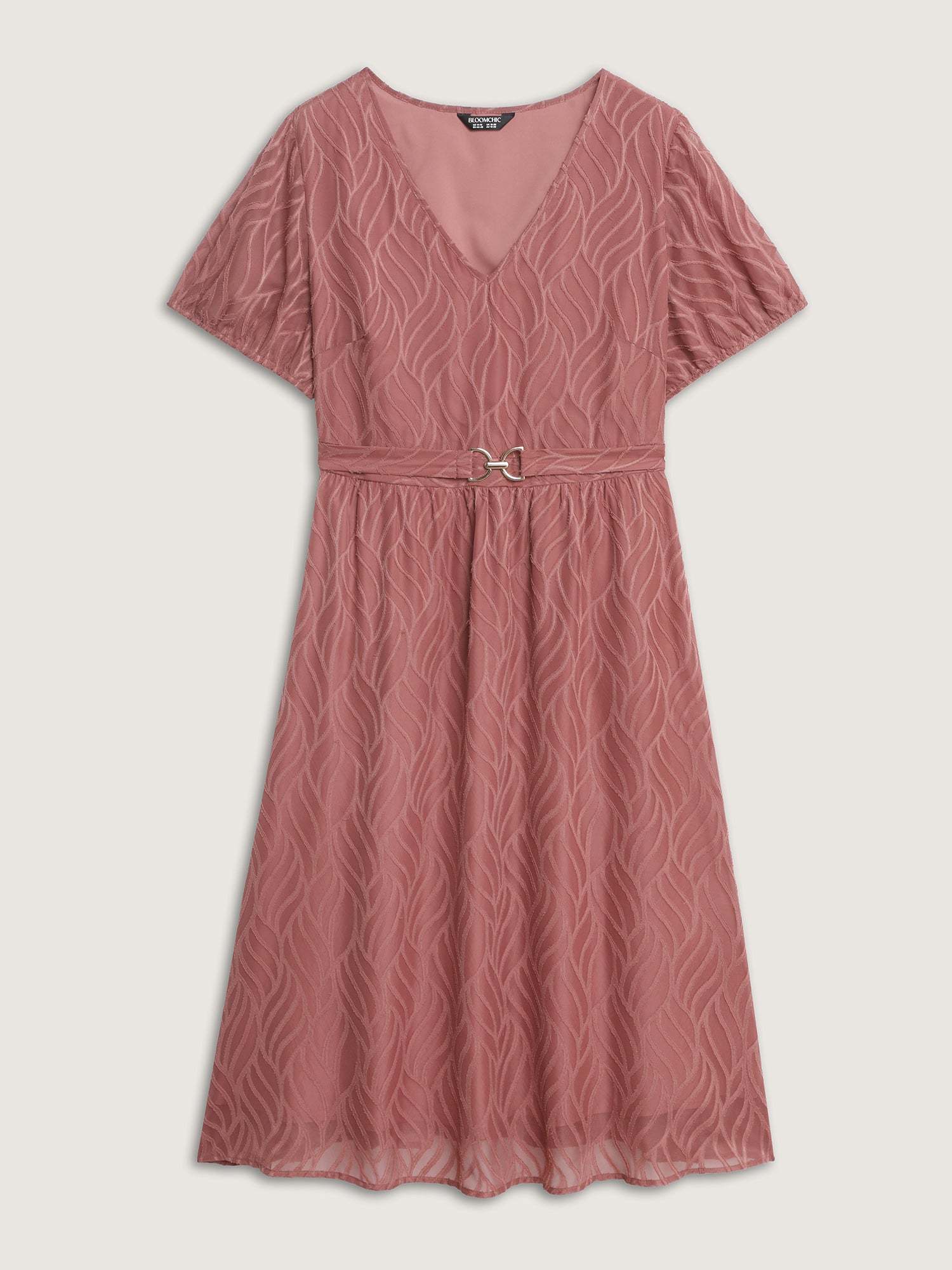 Shop Plain Textured Belted V-Neck Midi Dress now and redefine your style with confidence at BloomChic. Tailored for mid and plus-size women. This trendy Dress, sizes 10-30. You can never go wrong with BloomChic Dresses. Color:Dusty Pink;Style_2:Office;Neckline:V-neck;Sleeve Type:Lantern Sleeve;Prints:Floral;Details:Texture;Pocket:Side seam pocket;Belt:Belt;Closure Type:Non