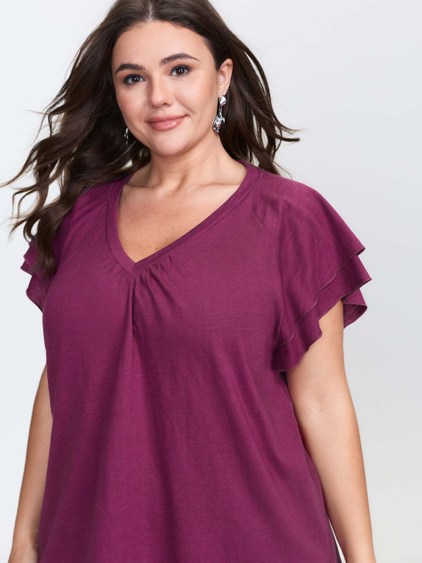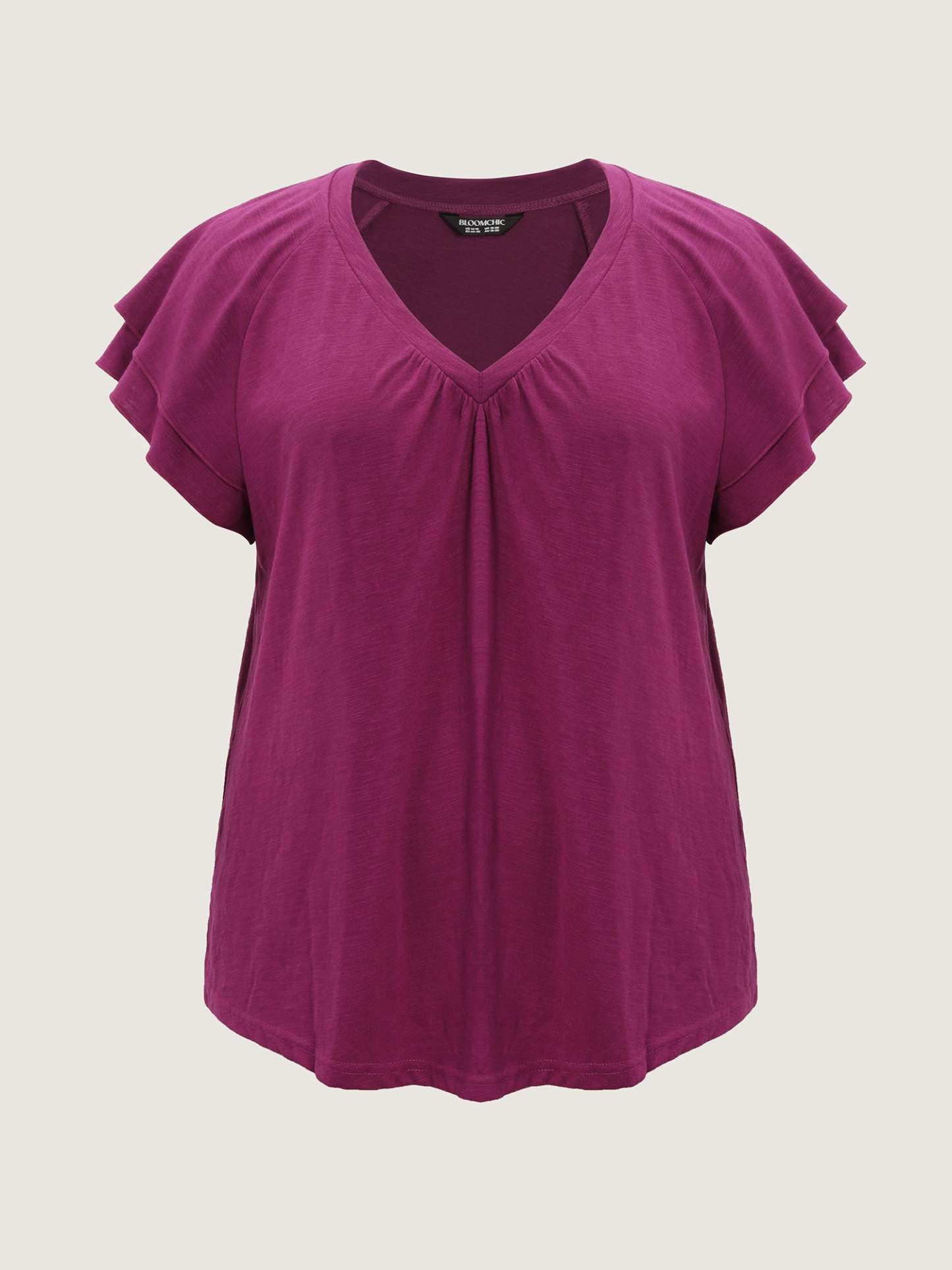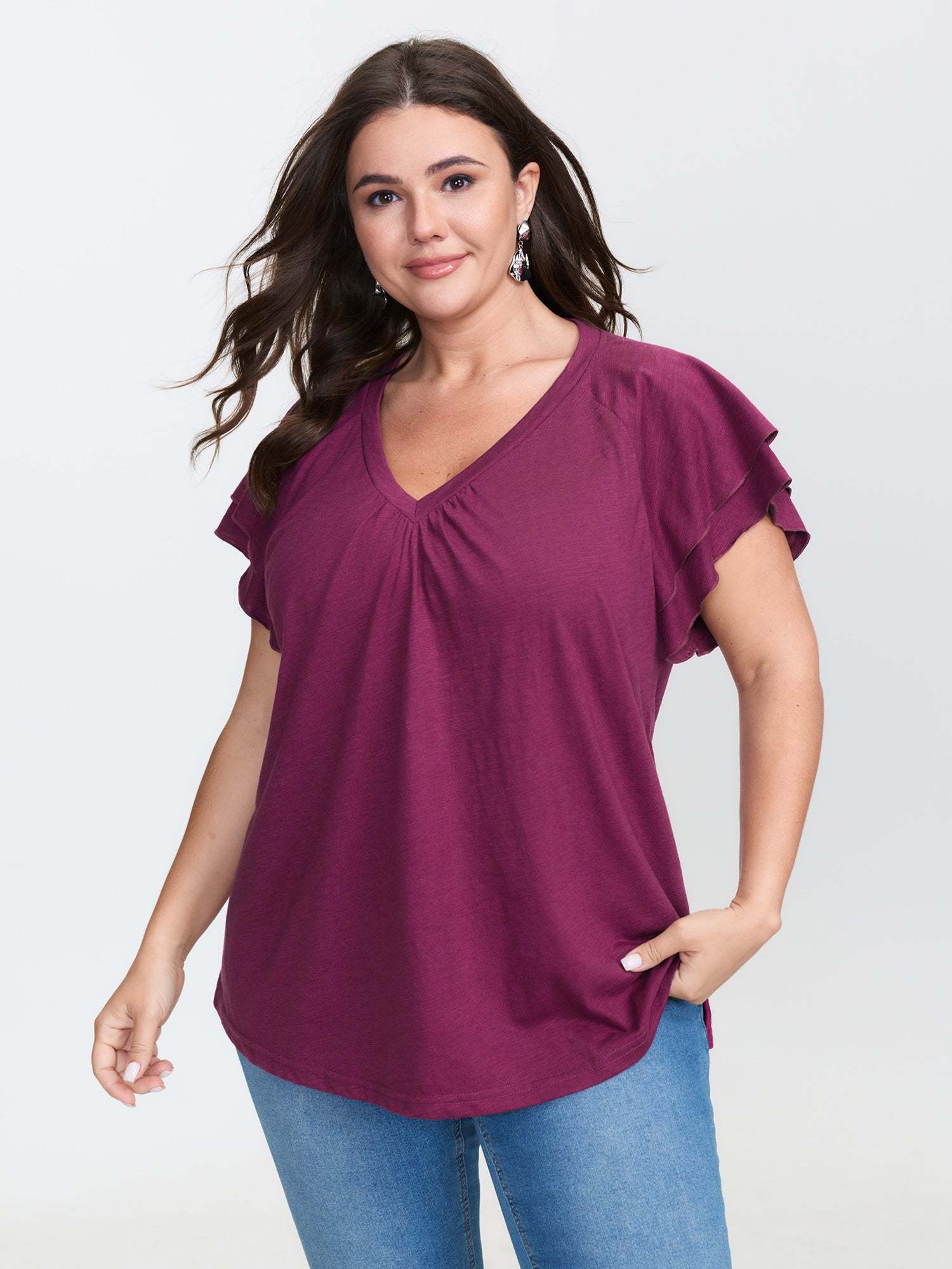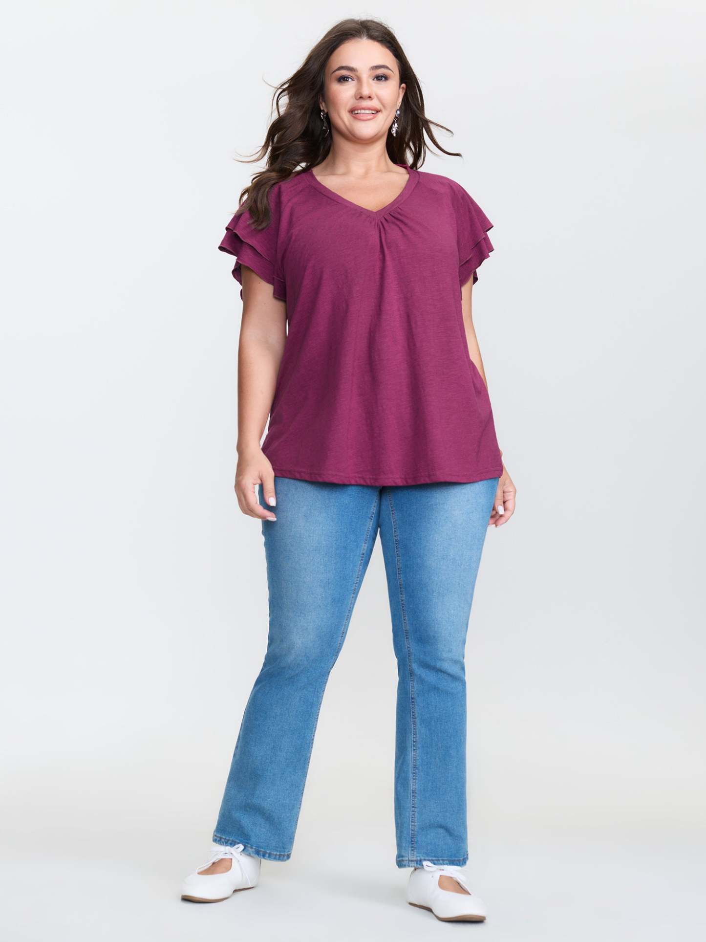 Shop Stretchy Textured Flared Sleeve T-Shirt now and redefine your style with confidence at BloomChic. Tailored for mid and plus-size women. This trendy Tops Women, sizes 10-30. Color:Red Violet, Cerulean;Style_2:Leisure;Pattern:Non;Neckline:V-neck;Sleeve Type:Cap sleeve;Details:Ruffles, Gathered;Pocket:No-pocket