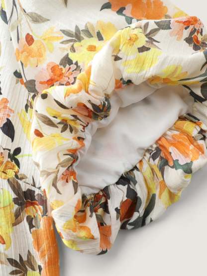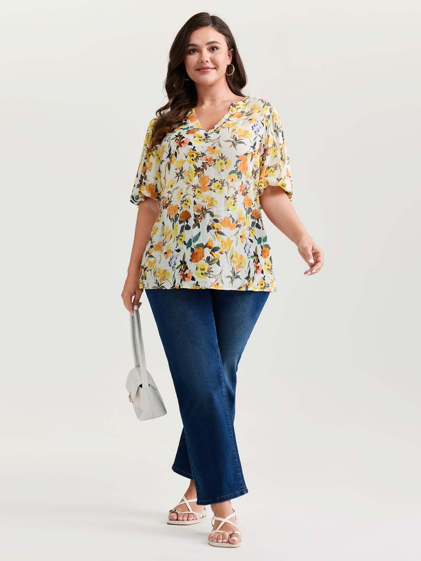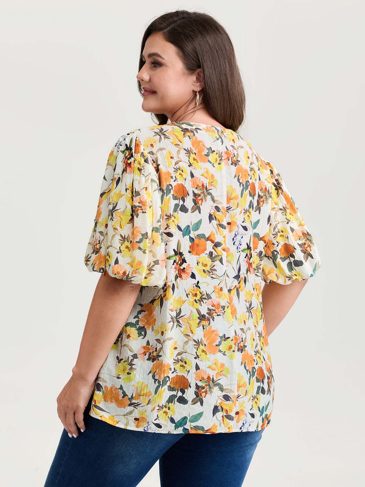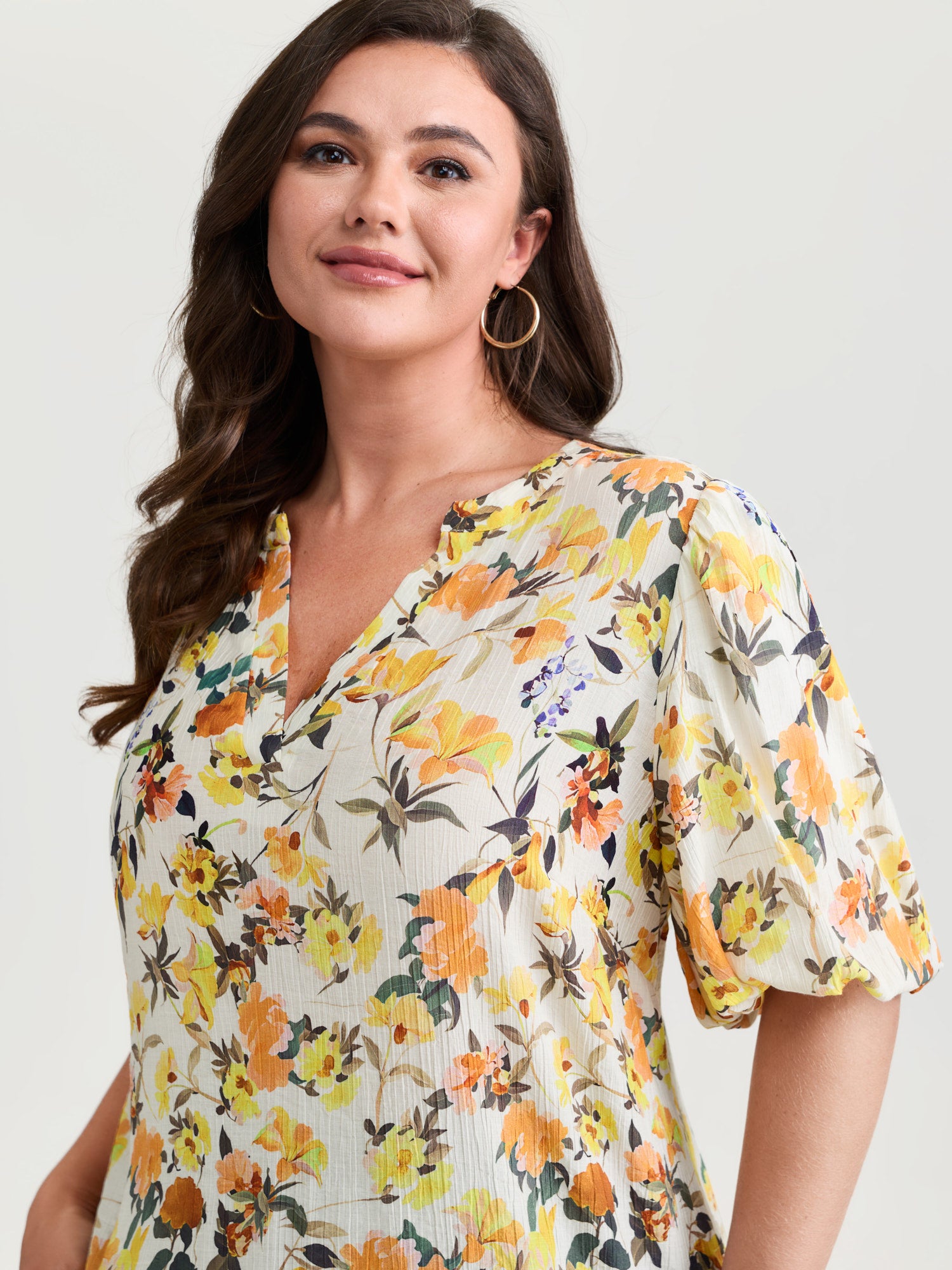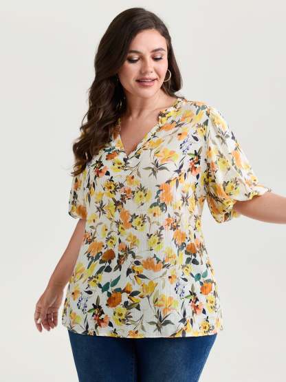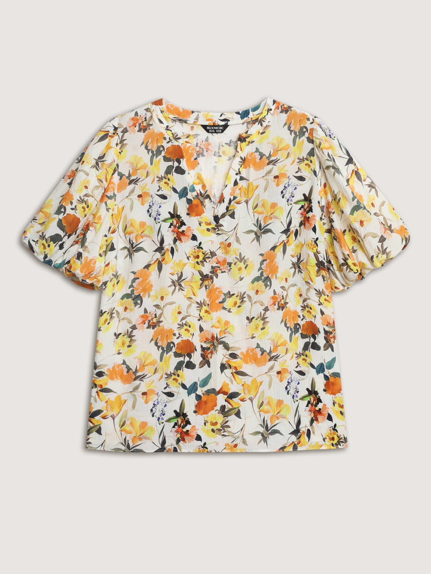 Shop Sunkissed Floral Print Bubble Sleeve Blouse now and redefine your style with confidence at BloomChic. Tailored for mid and plus-size women. This trendy Tops Women, sizes 10-30. Color:lvory;Style_2:Romantic;Pattern:Ditsy floral;Neckline:Flat collar with V-notch;Sleeve Type:Lantern Sleeve;Details:Gathered;Pocket:No-pocket