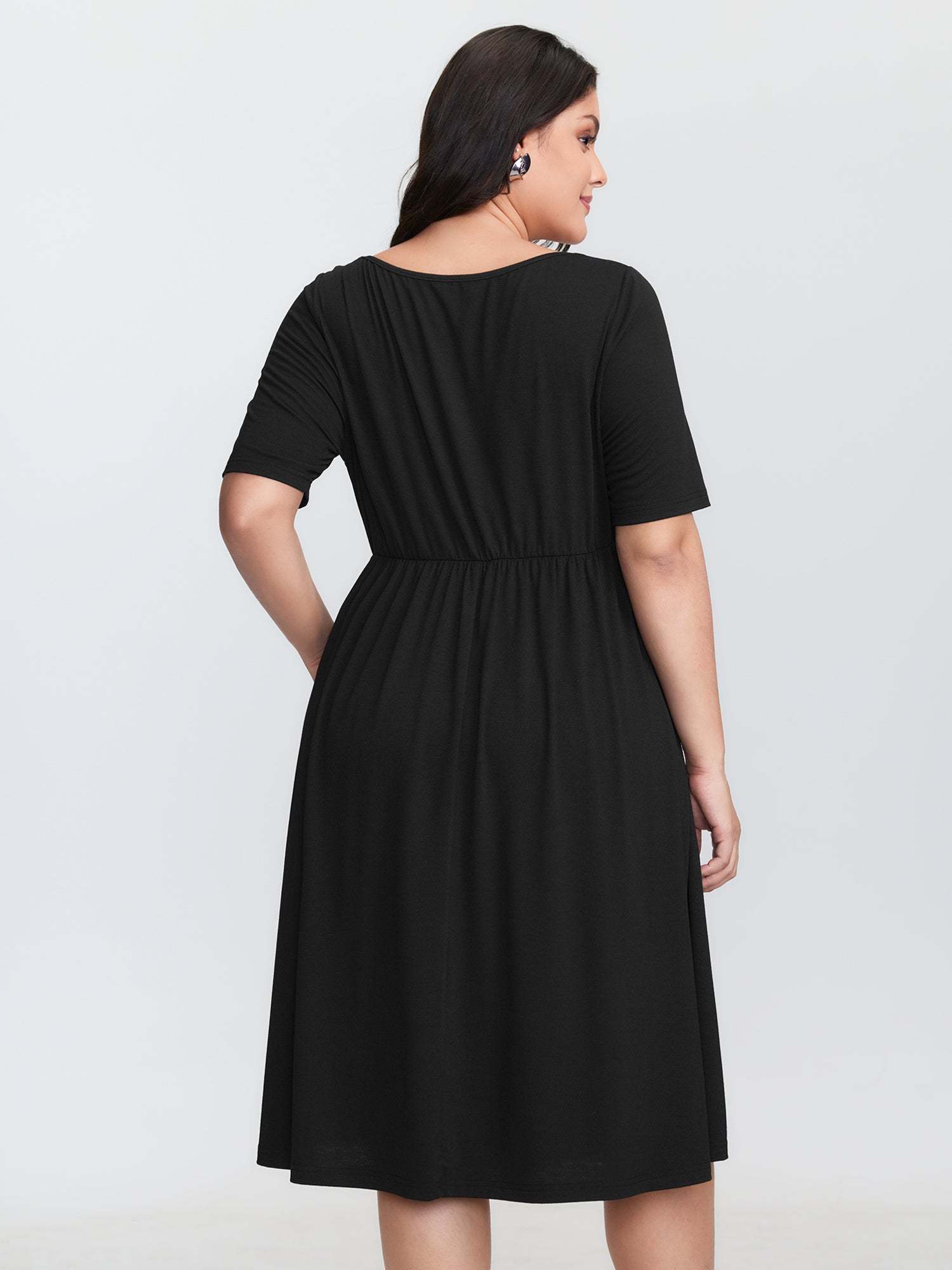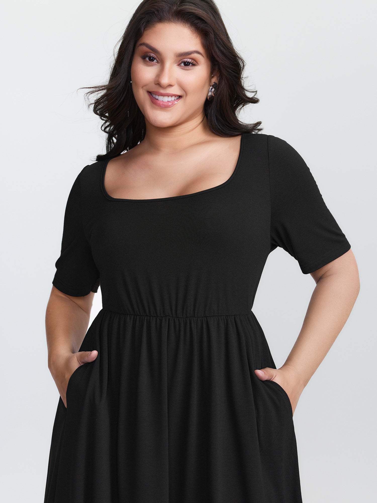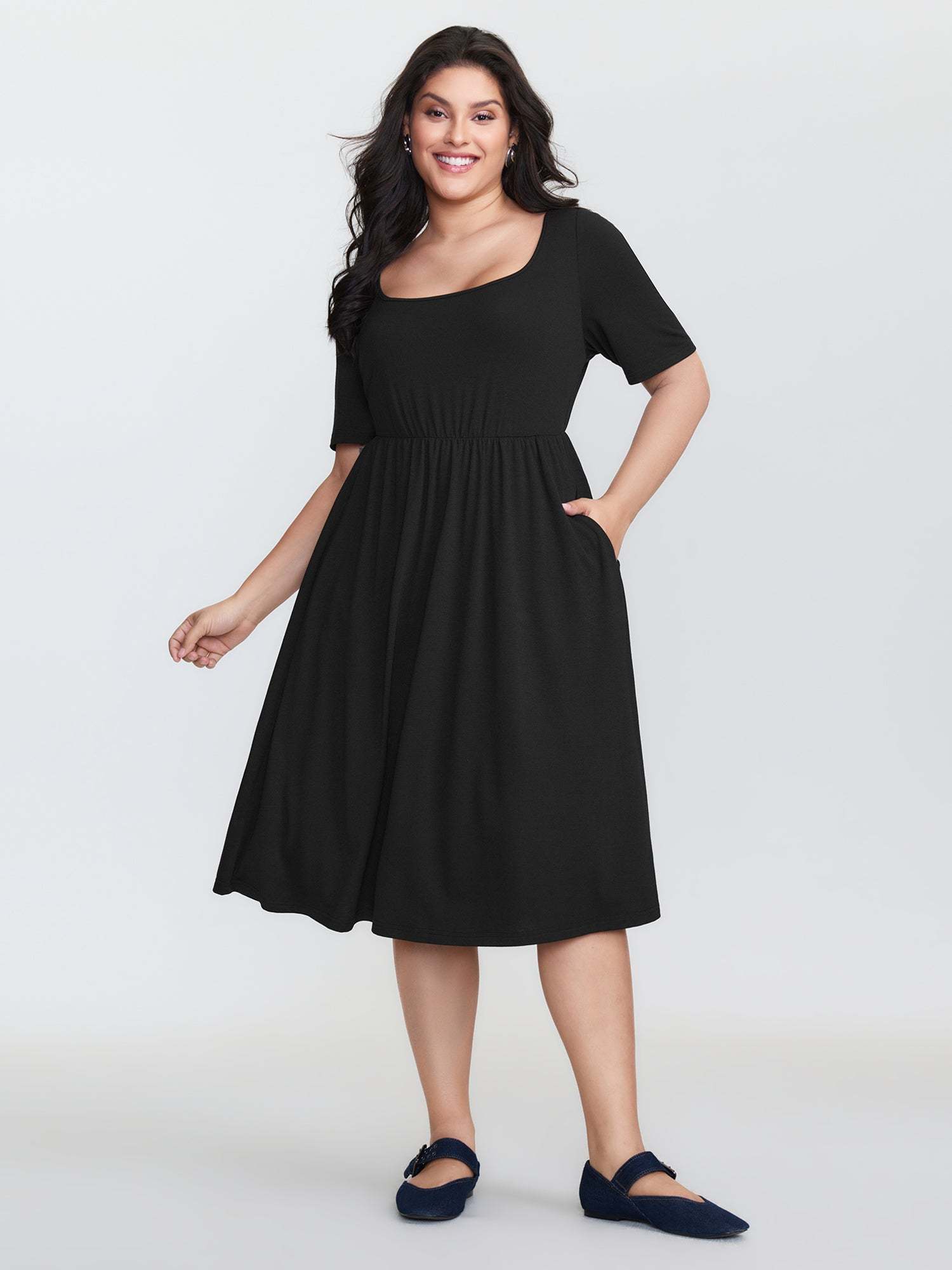 Shop Supersoft Round Neckline Plain Midi Dress now and redefine your style with confidence at BloomChic. Tailored for mid and plus-size women. This trendy Dress, sizes 10-30. You can never go wrong with BloomChic Dresses. Color:Black;Style_2:Leisure;Neckline:U-neck;Sleeve Type:Regular Sleeve;Pattern:纯色;Details:Gathered;Pocket:Side seam pocket;Belt:No-belt;Closure Type:Non